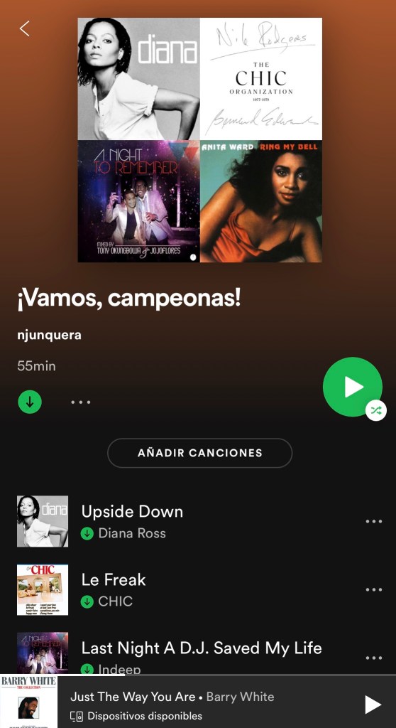 Lo hace casi todo bien, menos pinchar. La pobre no tiene oído musical, y como sabéis, el mío es delicadísimo. Es por ello que he decidido que a partir de mañana me la voy a poner en mute – me pierdo los “campeona”, pero ya sé más o menos dónde caen- , para poner yo mi propia música motivadora. He dedicado varias horas a elaborar la playlist perfecta. La hago pública porque creo, además, que le gustará a mis compañeras de la tercera edad. Me ha llevado mucho trabajo; ha sido un largo proceso de ensayo-error, pero la comparto en Spotify por los mismos motivos por los que ahora te puedes descargar gratis la edición impresa de EL PAÍS: son días para ser solidario. Se llama “¡Vamos, campeonas!”. Y suena así: