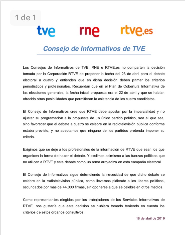 – Jueves. RTVE anuncia un cambio de fecha, al 23, el mismo día que A3media. Los consejos de informativos de TVE y RNE afirman que no lo comparten.