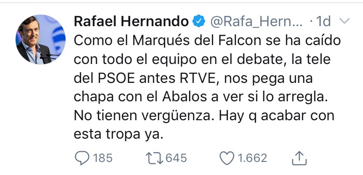 El mensaje del día: Aló, Sánchez. Yo me comprometí a acudir al debate de TVE el 22 y al de A3media el 23. Estoy tan ocupado en la campaña como tú. Votantes socialistas, “si os da vergüenza lo que ha hecho Sánchez, venid al PP”.