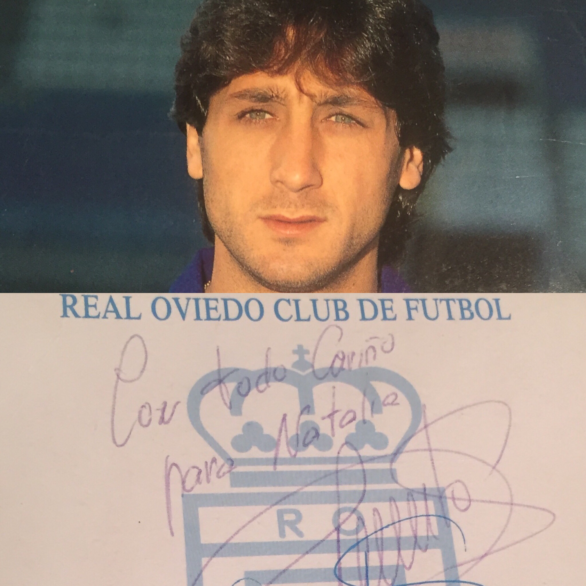 La foto de Carlos iba siempre conmigo, como los colores, que van por dentro y son una condena perpetua, en primera, en segunda o en tercera división. Colorada como un tomate, en pleno invierno asturiano, saqué la foto de ese bolsito en el que solo llevaba la foto de mi jugador favorito –qué más necesita una niña- y se la entregué. Carlos escribió: “Con todo cariño, para Natalia”. Es decir, pudo firmar sin más, o escribir simplemente “con cariño”, pero puso “con todo”, un detalle que yo, a día de hoy, tropocientos años después, aún le agradezco.